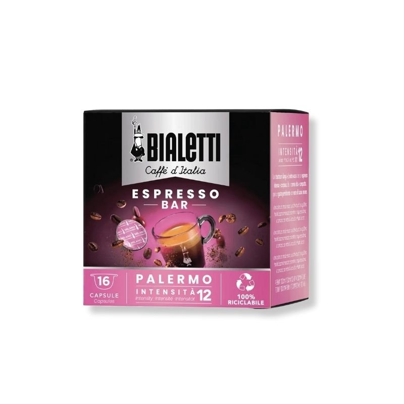 Savurează 16 Capsule Bialetti Espresso Palermo, o cafea intensă, cu aromă profundă și un gust amar caracteristic, inspirată de tradiția siciliană.
