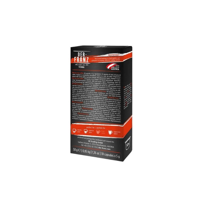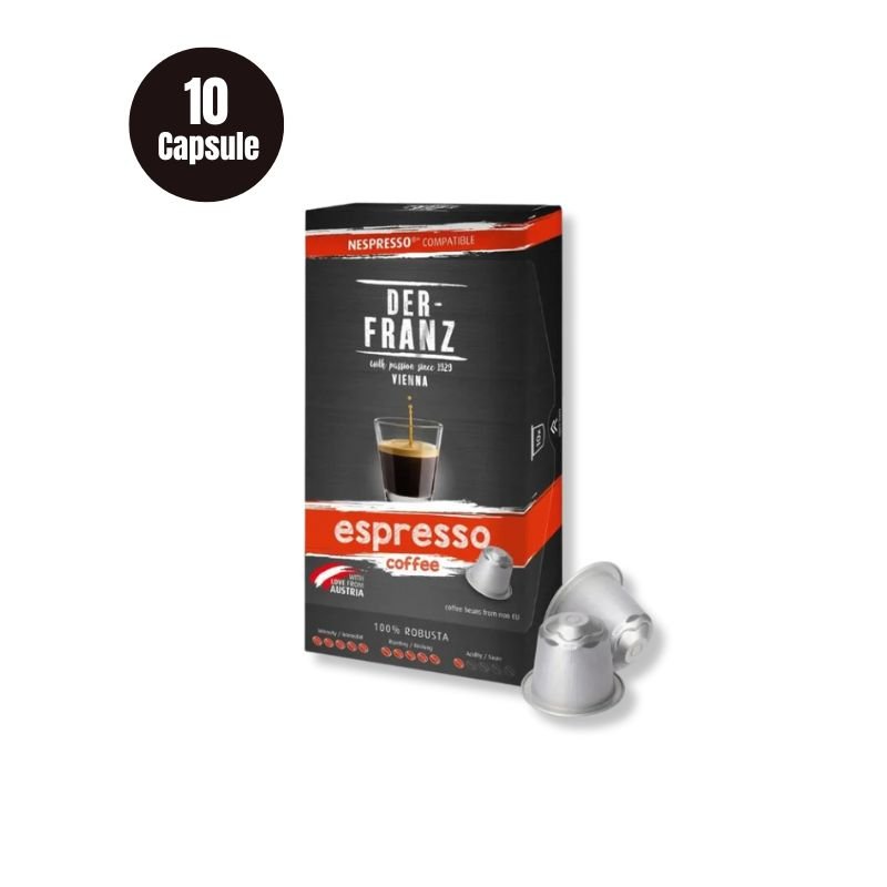 Capsule Cafea Der-Franz Espresso, 10 bucăți – cafea 100% Arabica, prăjire intensă, cu gust puternic și aromă echilibrată. Compatibile Nespresso®.