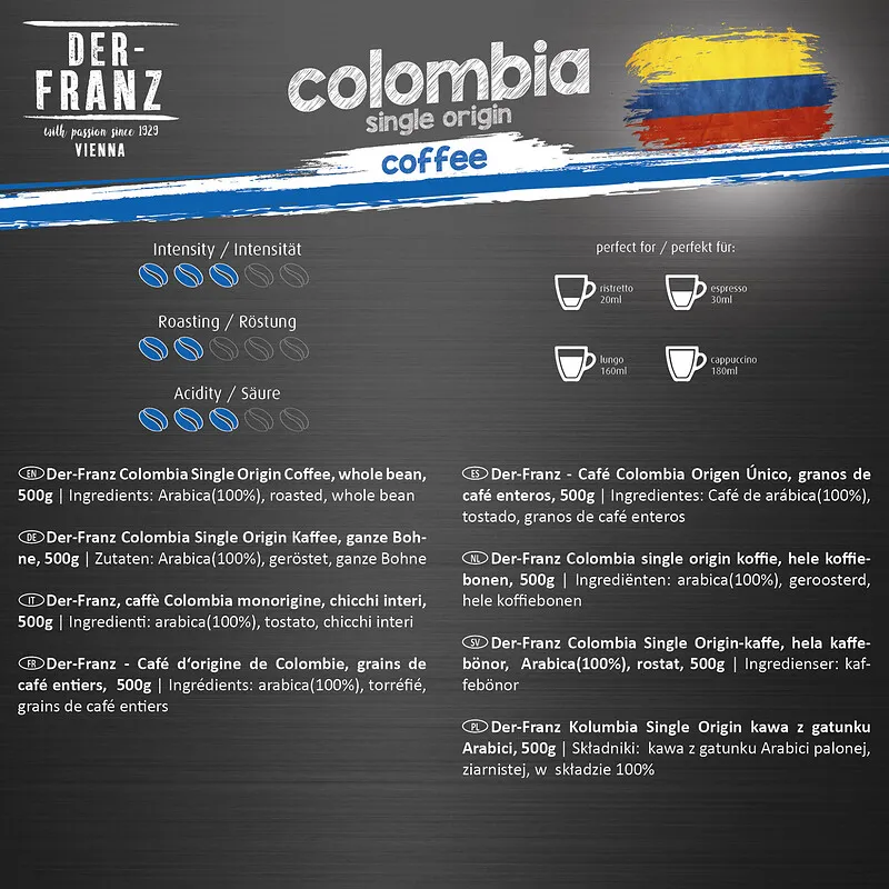 Cafea boabe Der-Franz Columbia, 500 g – o cafea de origine, cu gust echilibrat, note fine fructate și aromă intensă, ideală pentru iubitorii de arome autentice.