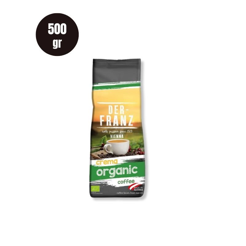 Cafea boabe Der-Franz Crema Organic, 500 g – o cafea certificată organic, cu gust echilibrat și aromă intensă, perfectă pentru un espresso cremos și natural.